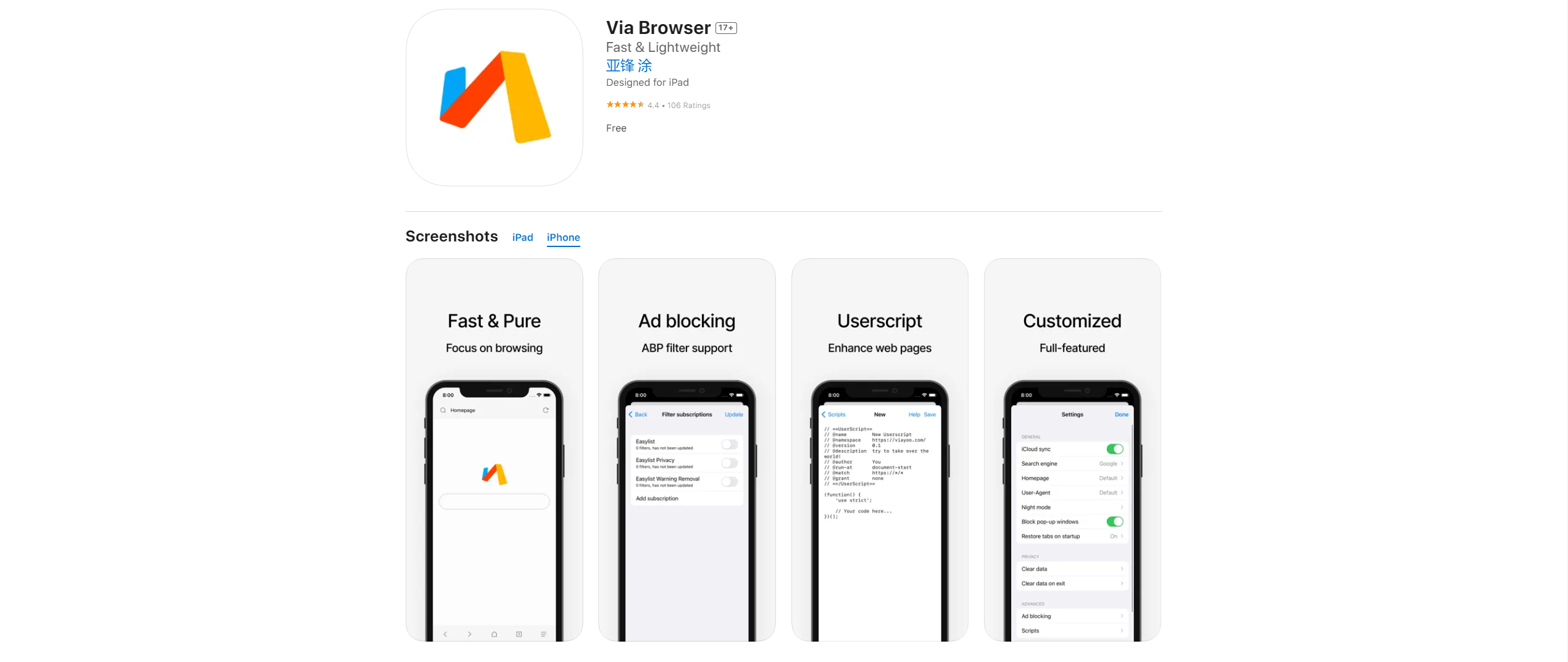 Via 是一款超级轻量化浏览器,仅占内存 2-4 MB。产品设计贯彻极简主义,不仅体量小不占内存,连 UI 也秉承着“Less is more”的设计理念,界面简单干净,首页没有任何奇怪的小说推荐、新闻推送、广告推送,开启网站超快。不过麻雀虽小五脏俱全,Via 也具有大部分浏览器该有的基础功能,它在为用户做减法的同时,也十分注重隐私保护,支持自动拦截广告弹窗;同时还可以自定义浏览器外观、书签管理、翻译网页、网页保存、资源嗅探等,十分适合手机内存告急的用户使用。