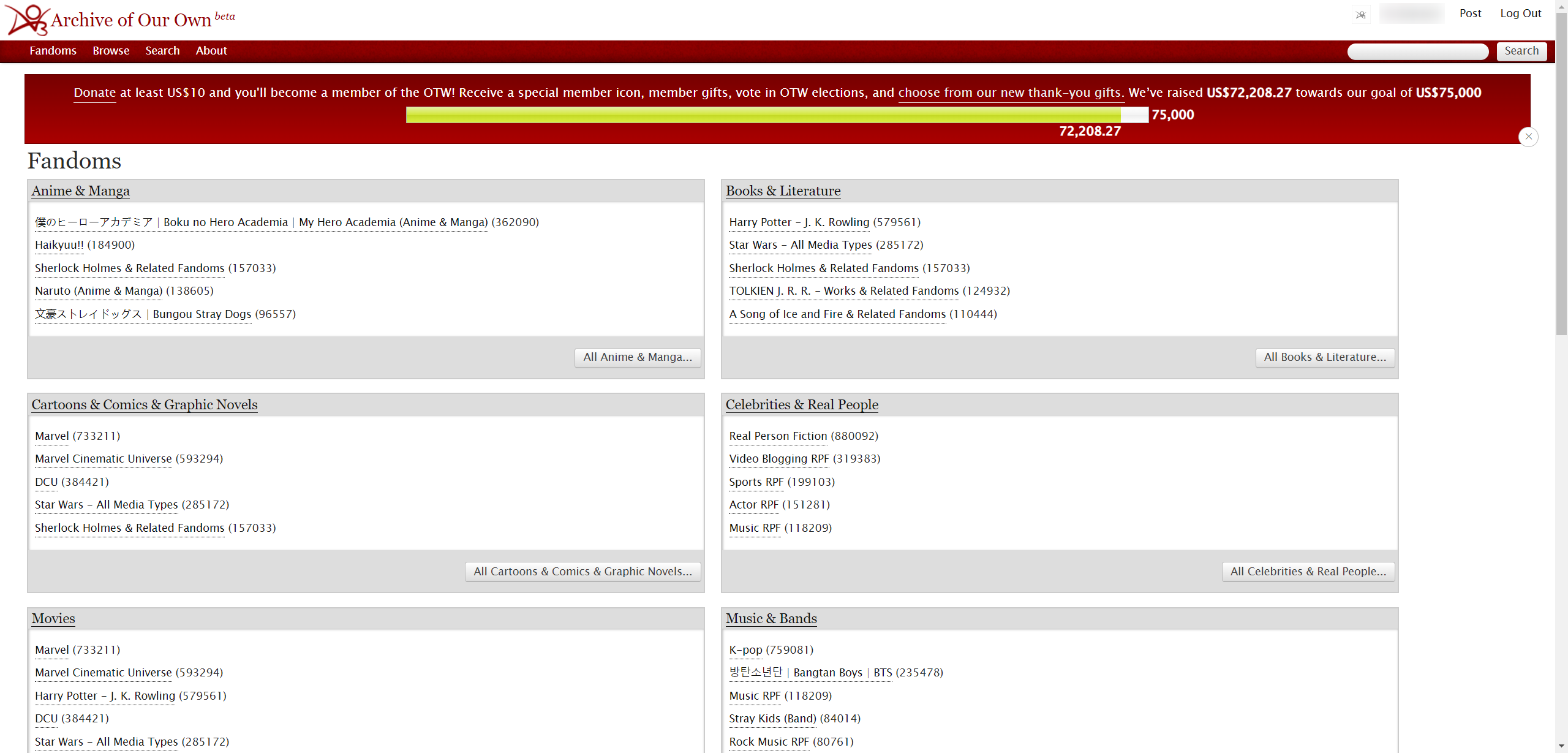Archive of Our Own(简称 AO3)是一个由非营利组织创办的,曾获雨果奖的国际知名的免费多语言同人文网站,这里几乎是全世界同人爱好者的天堂。无论你喜欢的是影视剧、小说、动漫、游戏,还是现实中的名人,只要你能想到的角色或 CP,基本都能在 AO3 上找到对应的同人作品。
