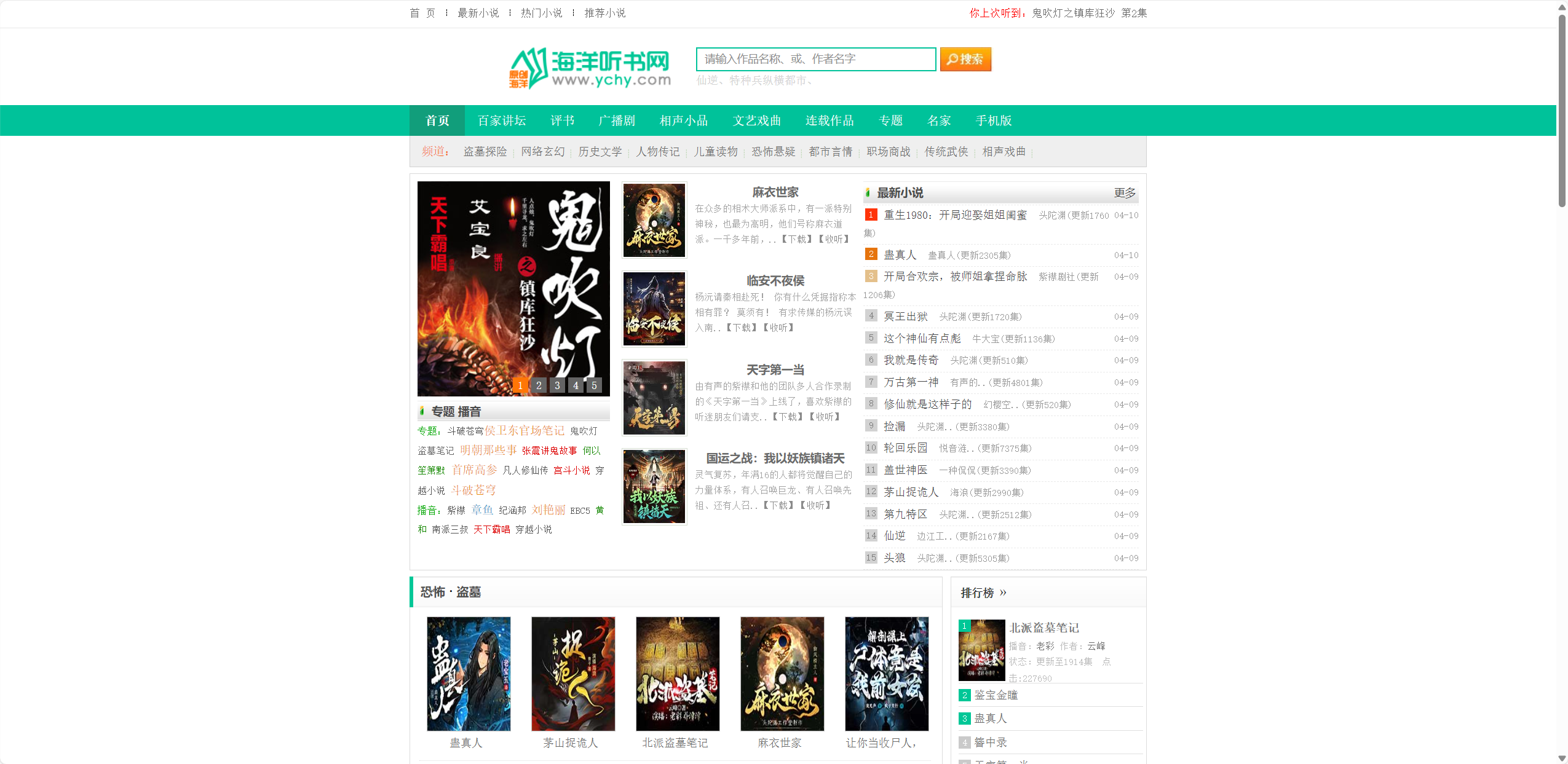 海洋听书网是一个免费的在线听书网站,网站中收录了最新最热、类型各异的小说、广播剧、评书、相声小品、文艺戏曲、百家讲坛资源,可按时间或热度进行排序,支持按关键词进行搜索,点击小说即可在线听书,无需注册登录,更无需付费。