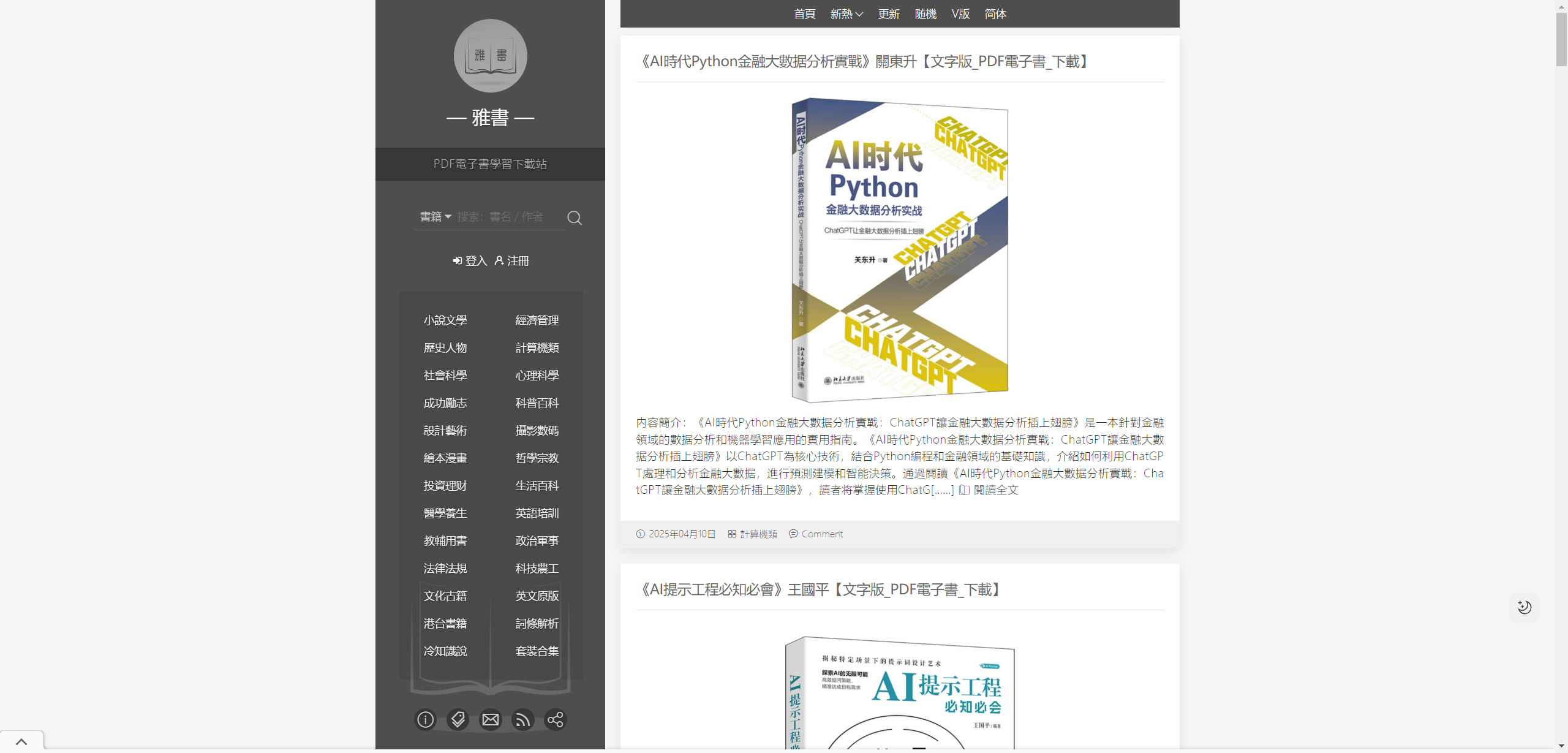 雅书是一个专注于提供免费 PDF 电子书下载的网站,涵盖了小说文学、经济管理、历史人物、计算机类、社会科学、心理科学、成功励志、设计艺术、摄影数码、绘本漫画、哲学宗教、投资理财、生活百科、教辅用书、文化古籍等多个类别,书籍收录非常齐全,并且每月保持新书更新。雅书支持查看热门书籍排行榜和高分书籍排行榜,也可获取随机推荐,可以按需求查找书籍。网站无需登录即可下载,非常良心。