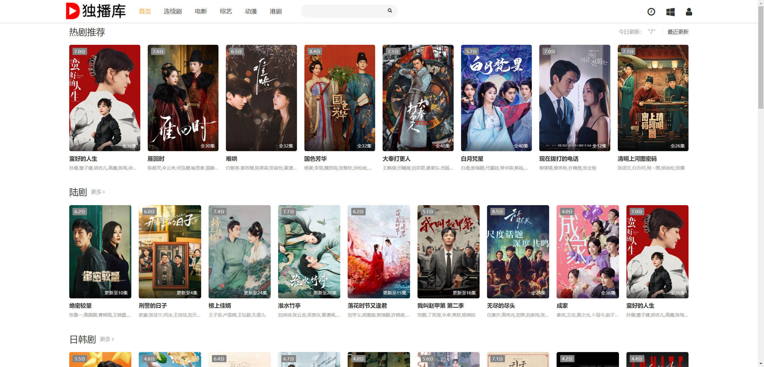 独播库是一个免费的在线影视网站。独播库内含海量国内外电视剧、电影、动漫、综艺、短剧资源,可看最新的人气国产电视剧,如蛮好的人生、难哄、九重紫、莲花楼、庆余年、玫瑰的故事、苍兰诀、狂飙等等,点击即看,连接快速,绿色无广告。网站采用免费模式,无需购买任何会员,也无需购买剧集,追剧无压力。此外,网站还支持查看历史播放记录、收藏视频、、点赞评论、切换皮肤等功能。