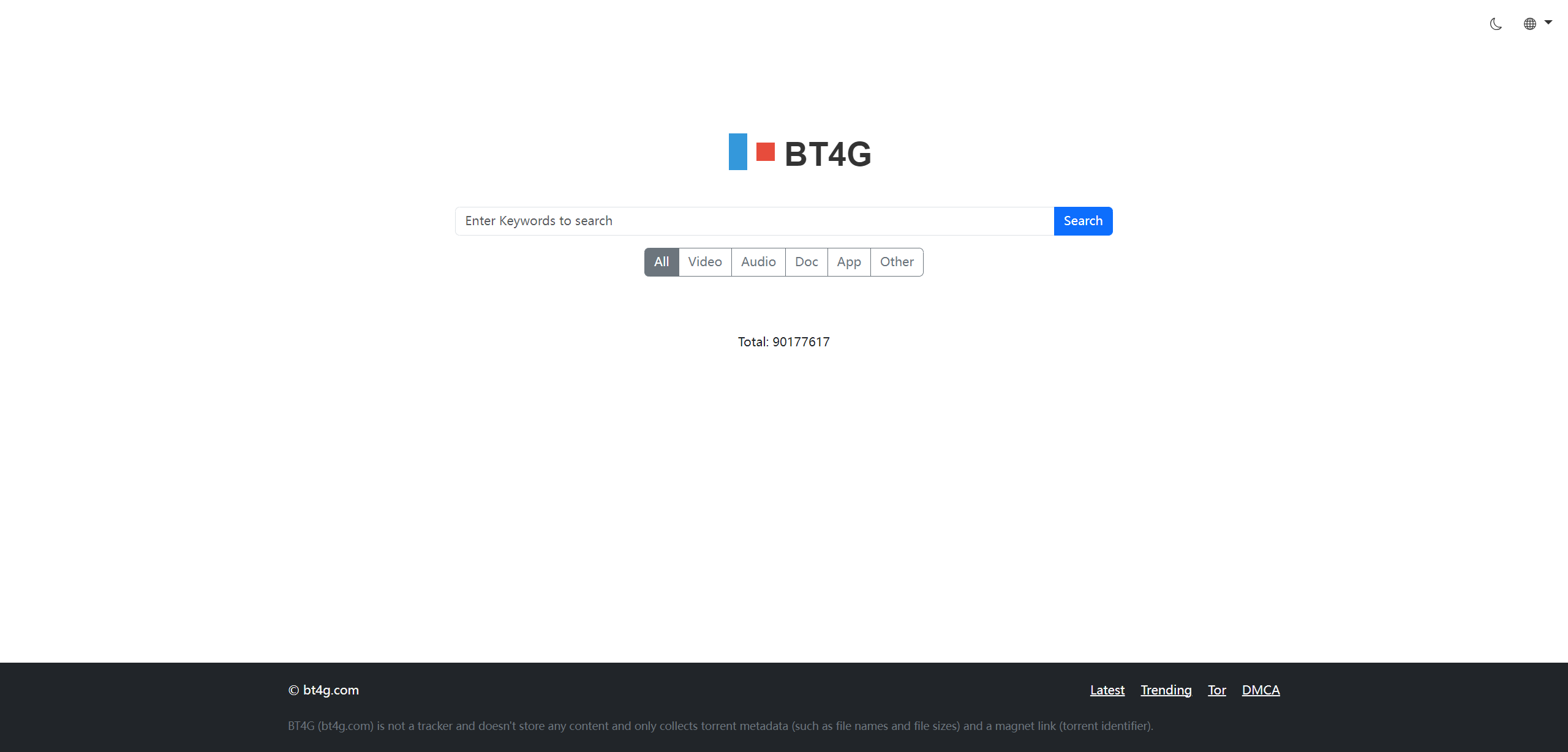 BT4G 是一个免费的磁力链接搜索引擎网站。该网站界面简洁、绿色无广,配备庞大的资源库,支持多语言关键词模糊搜索,只需输入资源名称即可一步直达资源链接,并可按视频、音频、文档、APP 等类别筛选,适合用于寻找冷门资源。