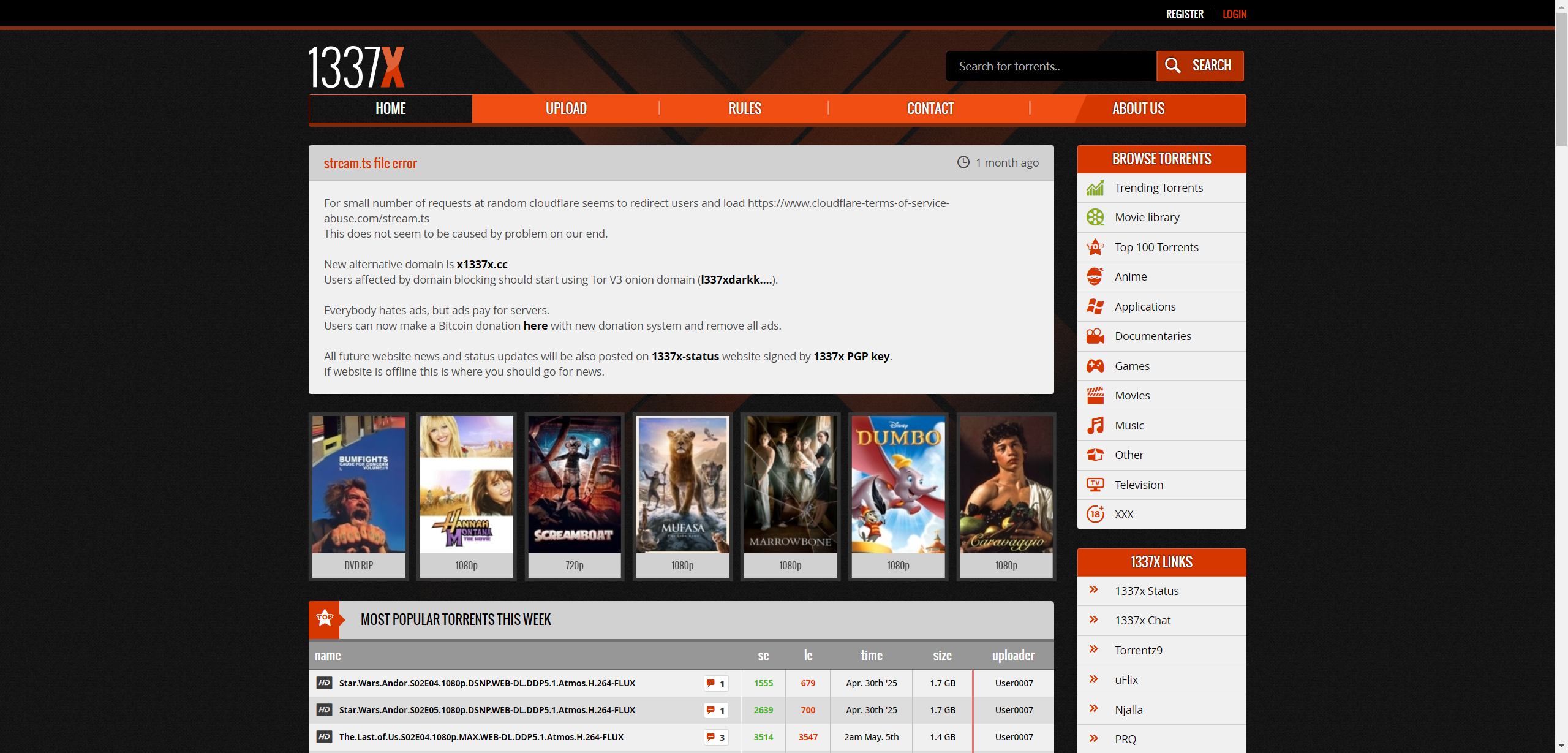 1337X 是一个发展已久的老牌磁力链接、种子资源搜索引擎。网站支持英文关键词模糊搜索,且仅显示英文结果,搜索结果可按时间、大小等排序,或按资源种类进行筛选。除了搜索功能外,1337X 还支持按分类查看当下热门资源,分类包括电影、电视剧、动漫、应用、纪录片、游戏、音乐、书籍、18+资源等等,海量资源任你挑选。成为注册用户后也可自行上传资源。