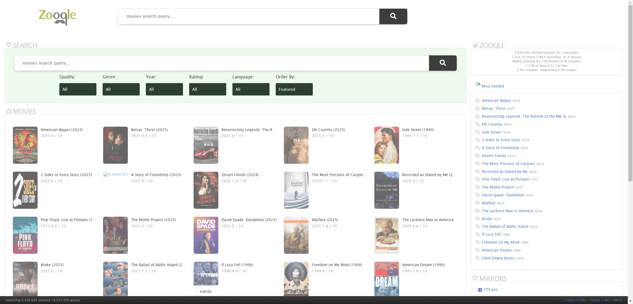 Zooqle 是一款国外的老牌种子、磁力链接搜索引擎。站内资源主要集中在影视方面,首页提供热门影视资源排行榜与资源列表,同时也支持关键词模糊搜索,搜索结果可按质量、类型、时间等分类。Zooqle 目前已收录四百多万份种子资源,并每日保持更新。
