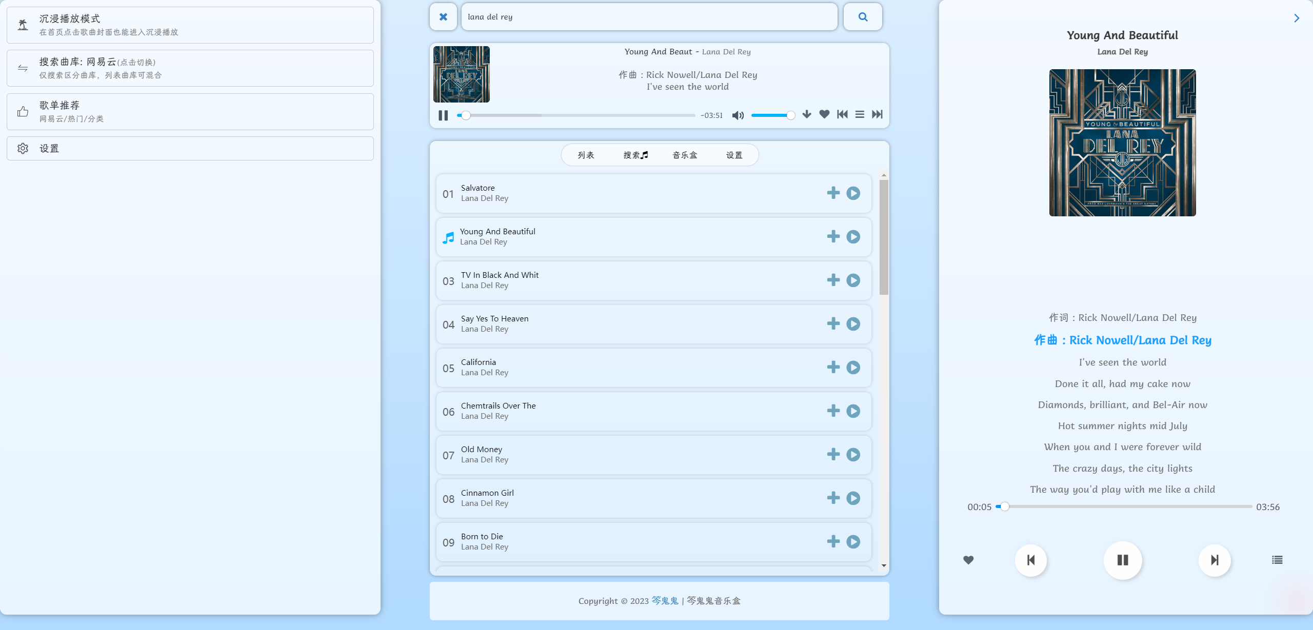 笒鬼鬼音乐盒是一款在线音乐播放器。网站内可免费听网易云、酷我中需要付费的歌曲,例如周杰伦、五月天、邓紫棋、杨丞琳、孙燕姿、陈奕迅、林俊杰、EXO、aespa、BLACKPINK、BTS、YOASOBI、米津玄师、LiSA、Rihana 等热门歌手及乐团的歌曲均有收录,即可在线收听也可本地下载。网站中可查看双平台(网易云和酷我)热门歌单推荐,并可按不同标签进行筛选。网站播放器界面简洁,功能完整,可自定义外观,创建播放列表及歌单,播放歌词等。