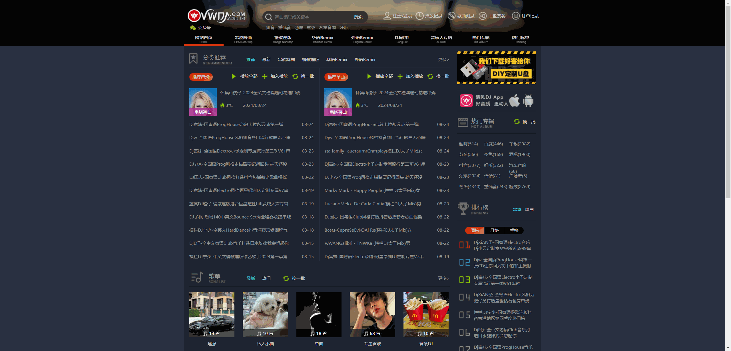 清风 DJ 音乐网是一个专注于提供高品质 DJ 舞曲的平台。该网站每天发布最新酒吧夜店潮歌,同步全球最新 DJ 歌曲,汇集了众多专业 DJ 制作人的作品,涵盖超劲爆 DJ 串烧、酒吧慢摇、中文 DJ 舞曲、英文 DJ 舞曲、DJ 慢歌连版、DJ 时尚节奏、DJ Remix、Mixes、Electro、House、Mashup、Pop、HipHop、Rnb、Funky、Reggaeton 等多种音乐风格,全方位满足 DJ 工作者及音乐爱好者的需求。用户可以通过网站首页浏览最新更新的音乐作品,或根据分类推荐、热门专辑、热门榜单等栏目发现心仪的歌曲,支持高品质音乐在线试听与下载。此外,网站还提供歌曲刻录服务,包括定制 U 盘、CD 刻录和 U 盘套餐等,通过线上定制、线下寄送的方式,方便用户将喜爱的音乐收藏并随时播放。