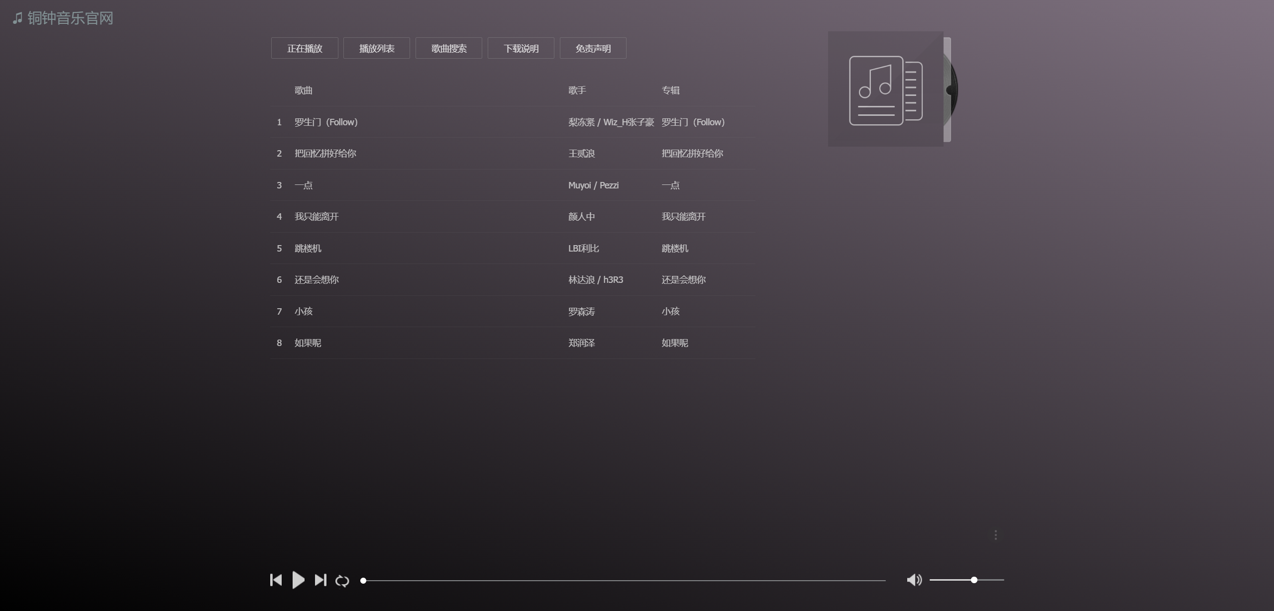 铜钟音乐是一个在线听歌网站。铜钟音乐主打零社交、无广告的纯净听歌体验,UI 设计采用极简风格,交互操作同样非常简便,网站内含丰富的音乐资源,支持创建播放列表在线听歌,也支持歌曲高品质下载。