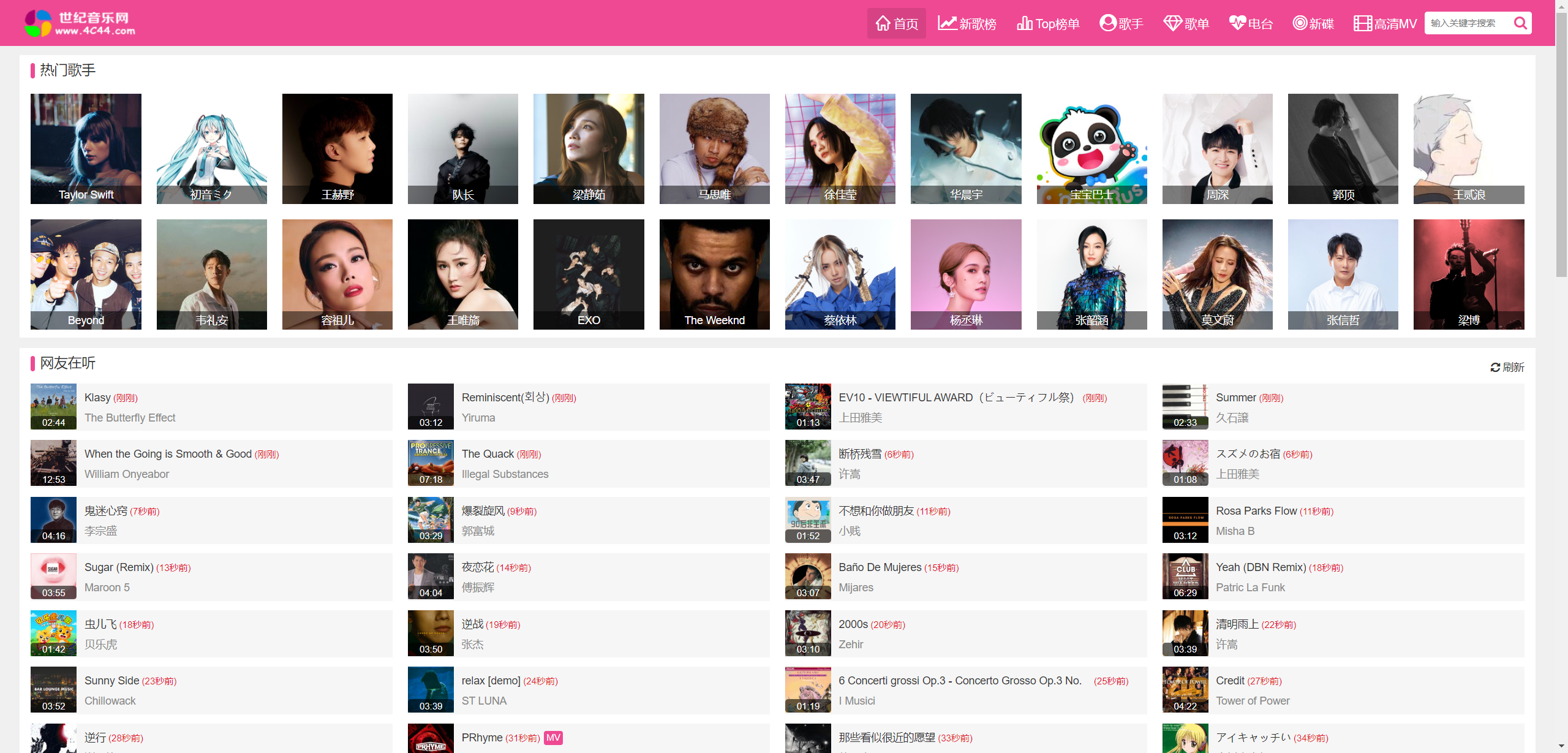 世纪音乐网是一个免费的在线音乐播放网站。网站内收录了国内外知名歌手的多首热门歌曲,包括周深、王菲、陈奕迅、林俊杰、五月天、凤凰传奇、Lady Gaga、初音ミク、aespa 等艺人或组合的作品,以及众多影视、游戏、动漫插曲配乐,几乎覆盖你想听的全部歌曲。首页提供多种歌曲榜单,可根据时间、国家、音乐类型、应用场景筛选热门歌曲,帮助用户快速挑选符合需求的优秀音乐。平台无需登录即可在线无限制听歌,支持歌词同步显示,并且可以免费下载高品质歌曲。此外,网站还提供不同类型的海量歌单,以及电台、高清 MV 等功能。