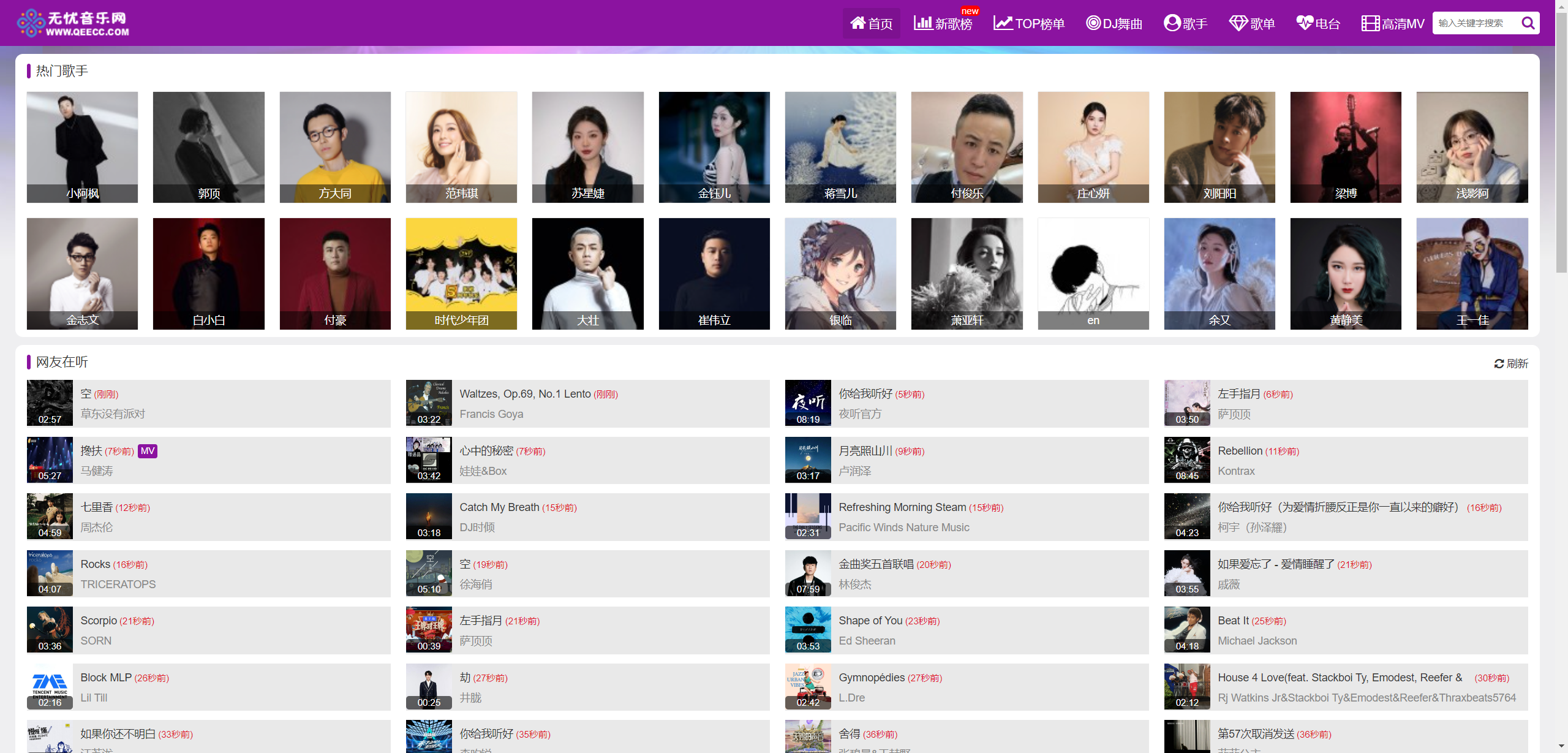 无忧音乐网是一个可以免费听音乐、下载歌曲的在线音乐播放器。无忧音乐网聚合了海量中外热门歌曲资源,涵盖了刘若英、张学友、Taylor Swift、林宥嘉、IU、BLACKPINK、米津玄師、OneRepublic 等歌手及组合的热门作品;此外,平台还收录了丰富的影视原声、动漫配乐和游戏音乐,基本囊括了用户日常喜爱的各种曲风。首页提供多个排行榜,可按地区、类型、时间热度分类,便于用户迅速筛出适合当下播放的音乐。该站点无需注册登录即可无限制畅听,歌词可实时同步显示,并支持高音质音乐免费下载。此外,还提供风格多样的歌单、电台节目和高清视频 MV 模块,满足多样化的休闲需求。