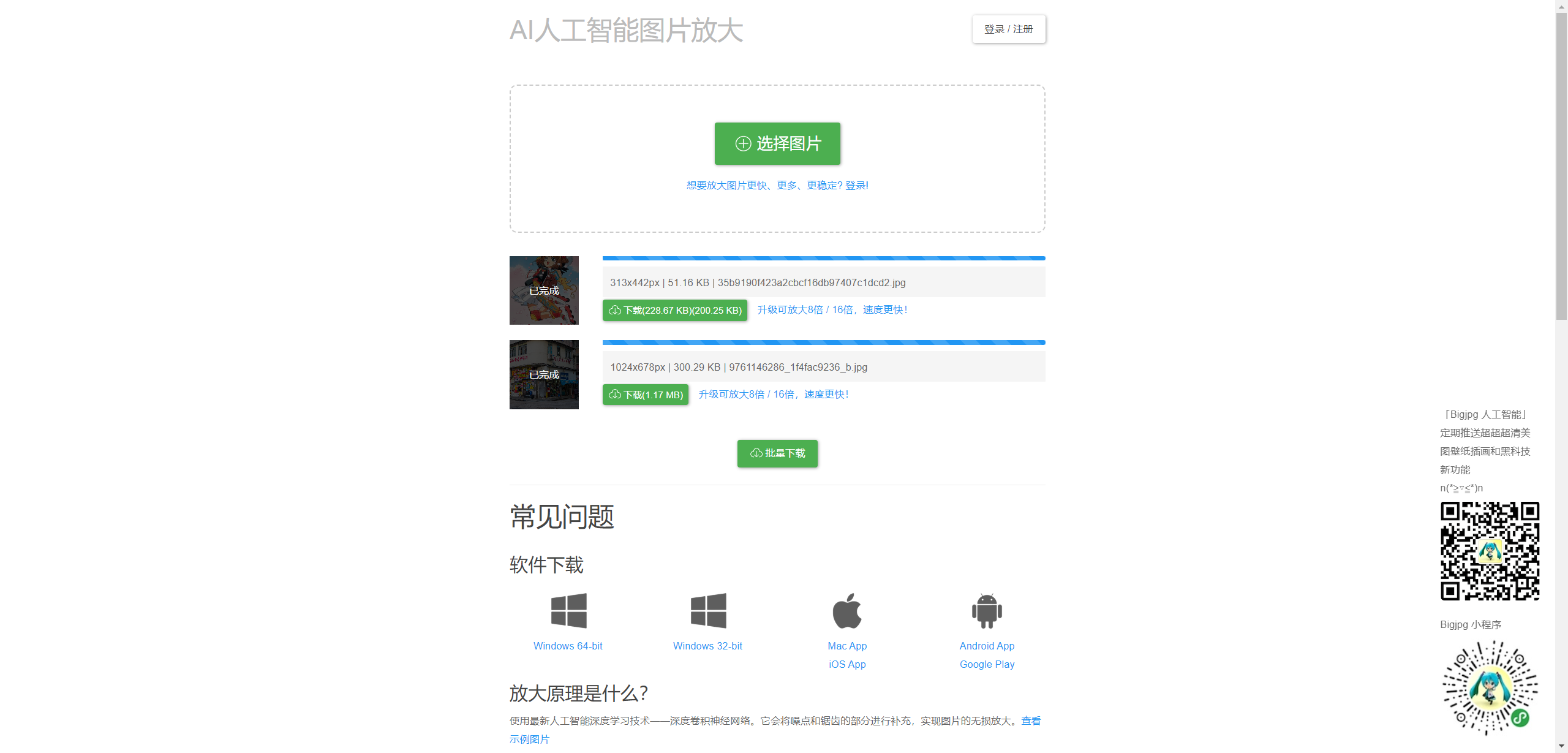 Bigjpg 是一款使用最新人工智能深度学习技术——深度卷积神经网络的 AI 图片放大工具,不仅支持在线使用、微信小程序,也提供可安装至本地的电脑软件和手机 APP。