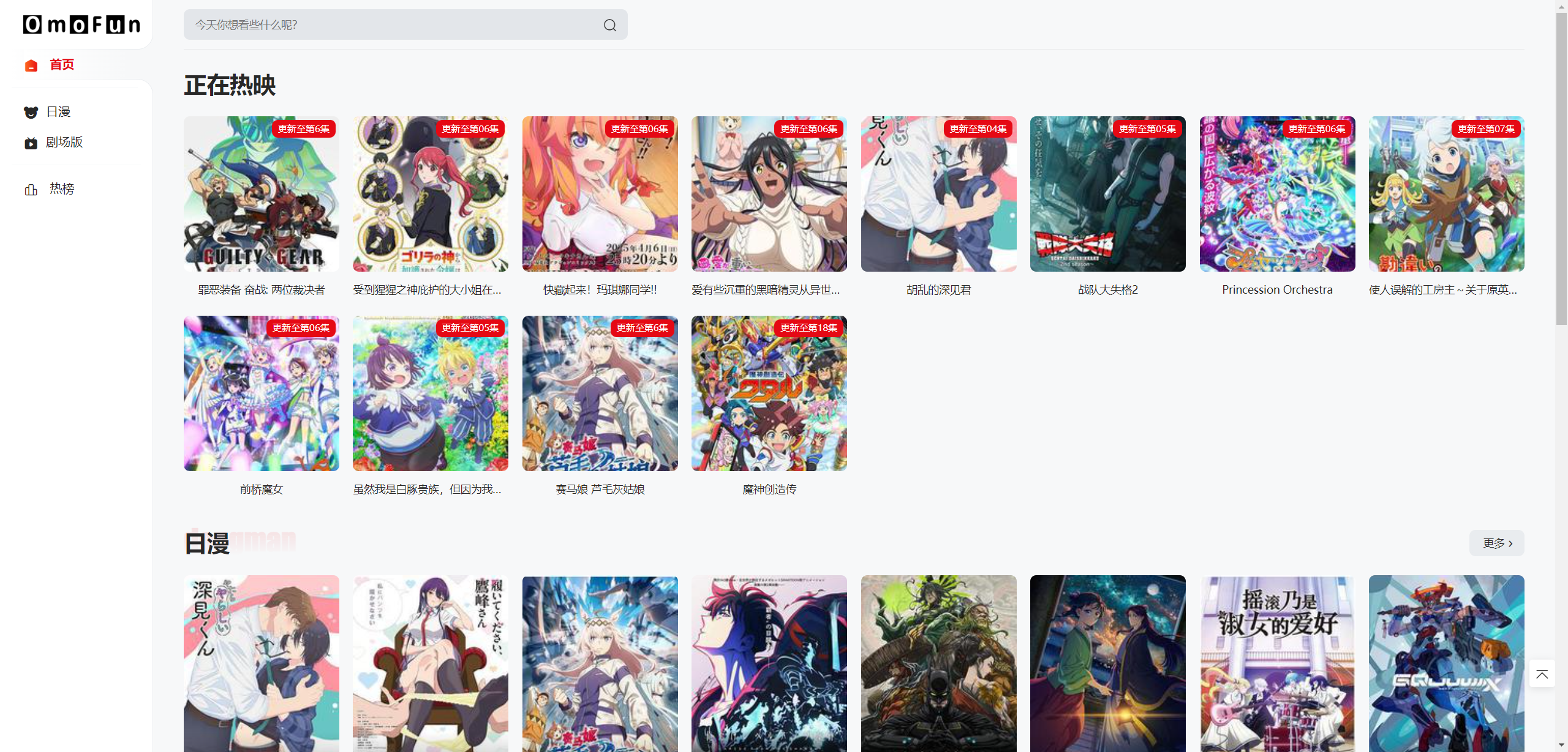 OmoFun 首页提供热播排行榜,可在其中挑选感兴趣的动漫番剧观看,也可按照年份筛选番剧。