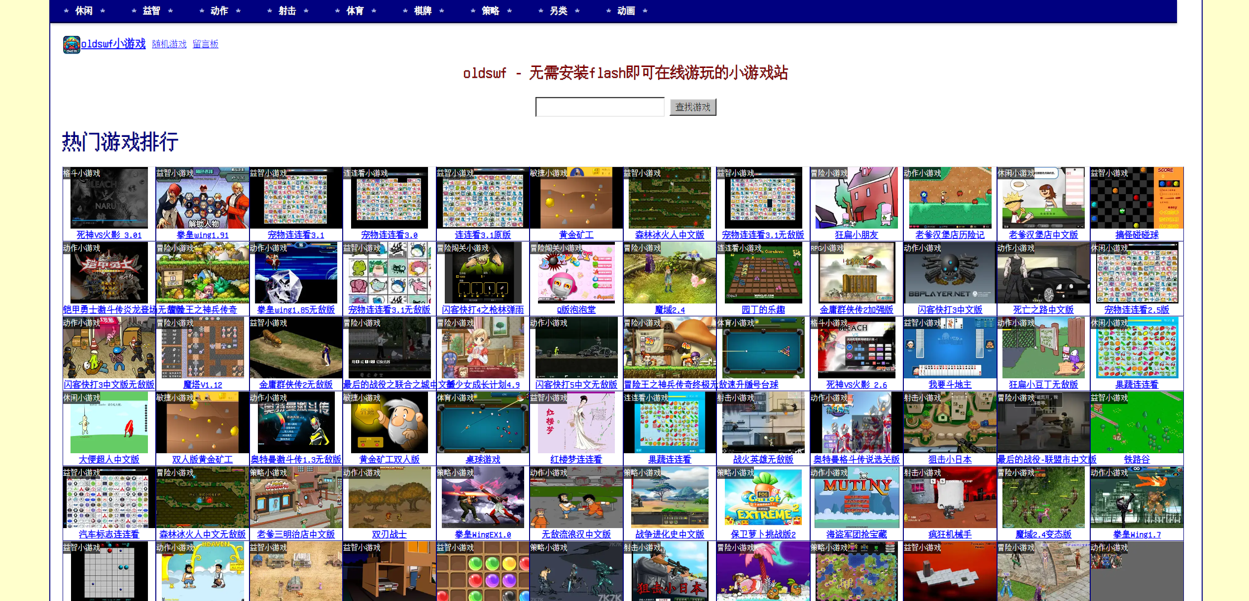 oldswf 是一个免费的在线游戏平台。oldswf 收录了大量经典的复古小游戏,例如黄金矿工、连连看、森林冰火人、拳皇、狂扁小朋友、金庸群侠传、星猫大富翁、超级马里奥等等,目前共有 9 种分类,每种分类下还包含多种更细致的子分类,既可以按分类查找游戏也可以直接搜索游戏名称查找游戏。玩游戏时支持调节界面比例,可任意放大缩小或调至全屏模式。