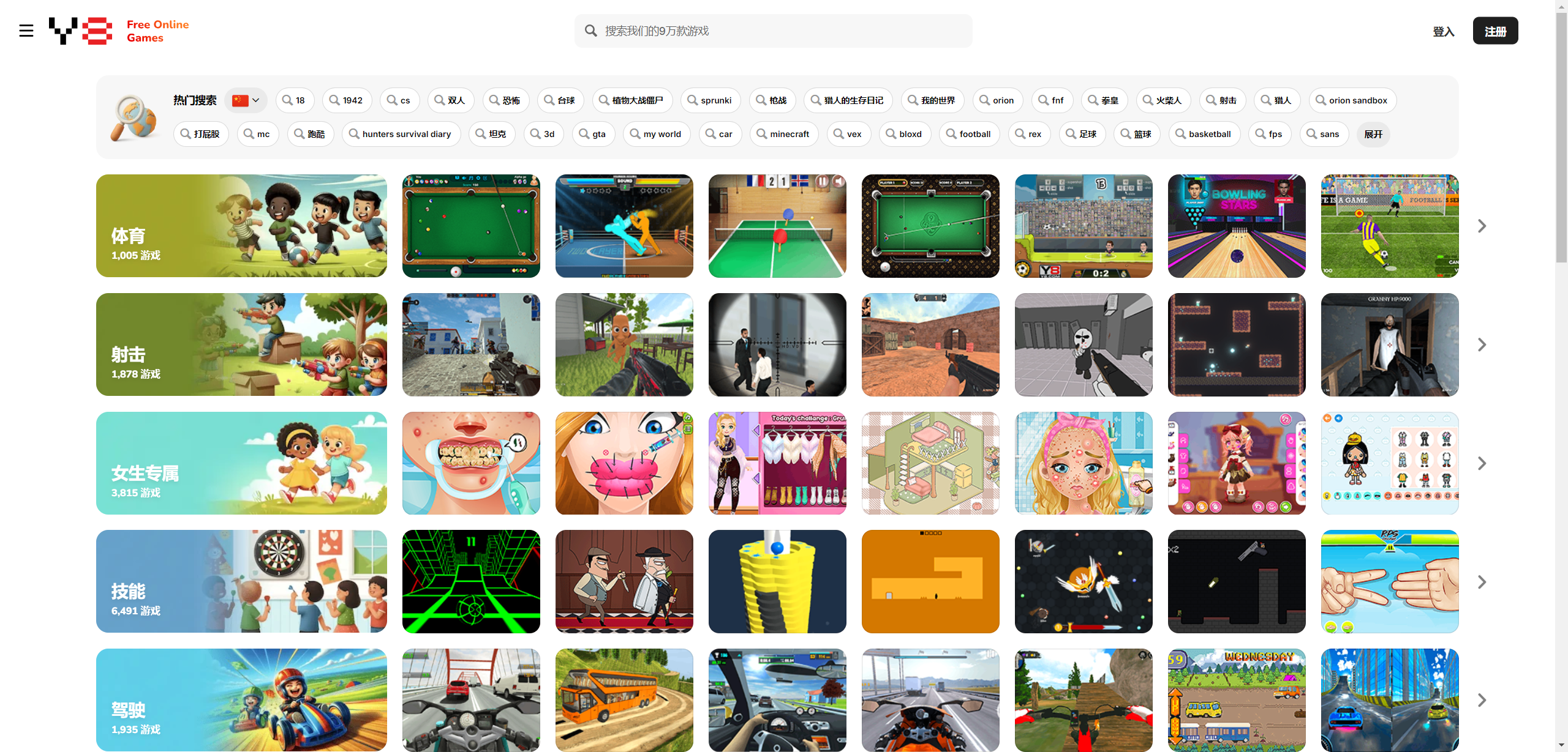 Y8 Games 是一个国外流行的在线游戏平台,自 2006 年开始运营,已有 19 年历史之久,至今共收录了 90,000+ 款原创小游戏,涵盖各种游戏类型,可玩单机游戏,也可进行多人合作游玩,无论你喜爱什么风格的游戏都能在这里畅玩到爽。Y8 Games 首页设计美观,标签分类系统一目了然,不仅可按分类查找游戏,也能在底部用标签进行更精确的查找。Y8 Games 支持上百种语言,顶部提供搜索栏功能,可用本国语言进行搜索,并提供相应地区的热门搜索词,你不仅可以在这里玩到最新最热的免费游戏,也能了解到近期流行的游戏趋势。目前,Y8 Games 已有 3000 多万用户,社区活跃度超高,注册账号可在社区论坛内进行交流互动。