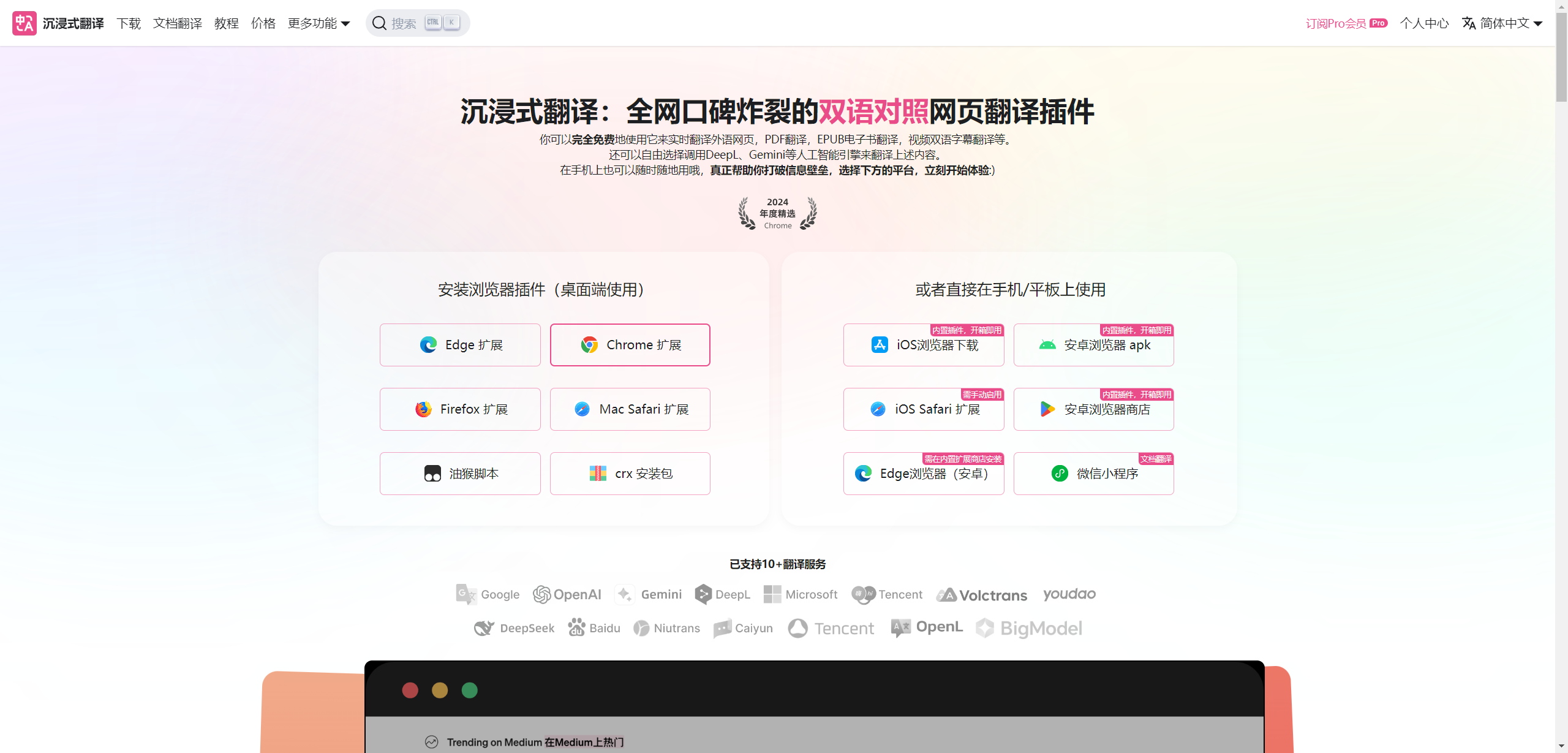 沉浸式翻译是一个网页翻译插件,可提供沉浸式的网页翻译,可以最契合原网页的设计样式实时转换翻译,另外它也提供微信程序与手机 APP。