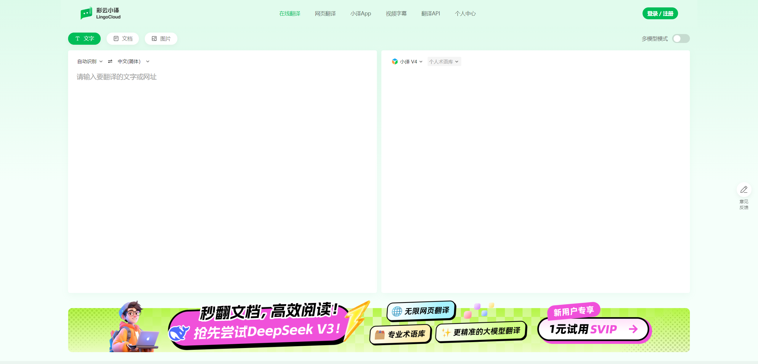 在近几年,彩云小译引入了 AI 翻译功能,其提供多款偏重于不同专业领域的 AI 模型,进一步提升了翻译的精准度、专业度与可读性,可切换不同模型进行文本翻译、即时语音翻译、图片翻译、文件翻译、网页翻译、视频字幕翻译,支持 19 种语言。