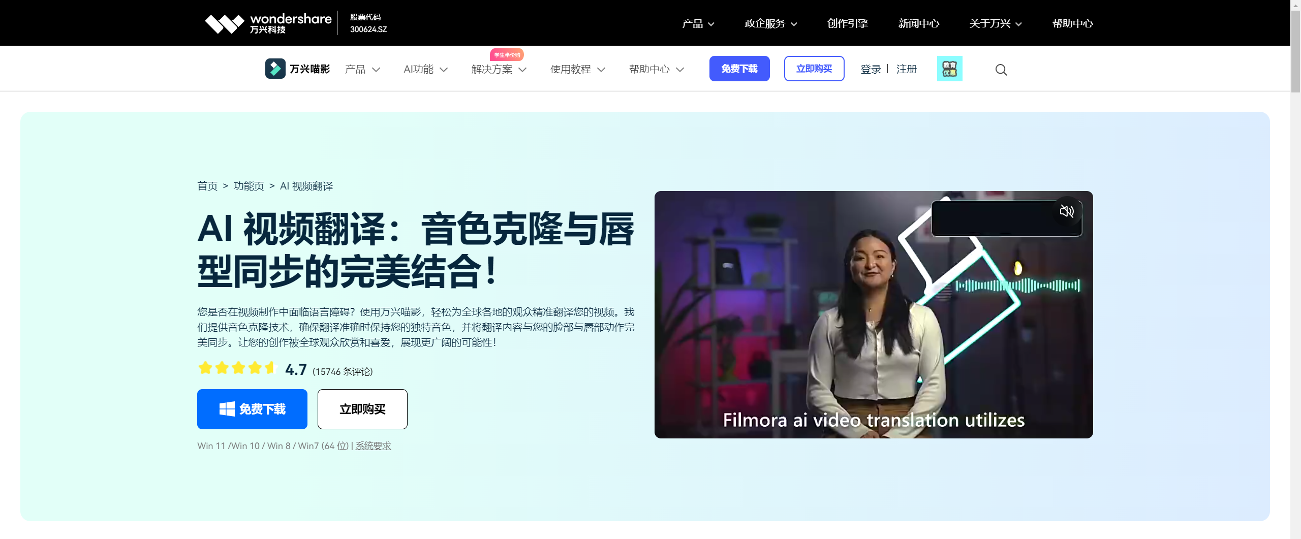 万兴喵影,英文名 Filmora,同样也是一款 AI 视频生成、剪辑软件。万兴喵影提供的 AI 视频翻译功能可以自动将视频语音和字幕翻译成包括英语、西班牙语、德语、日语、中文和印地语在内的 8 种语言,翻译准确率高达 95%。此外,它还能克隆人声,让翻译后的语音仍保留原有音色和情感,同时通过 AI 视频生成技术同步唇形,非常适合企业出海、自媒体等用途。