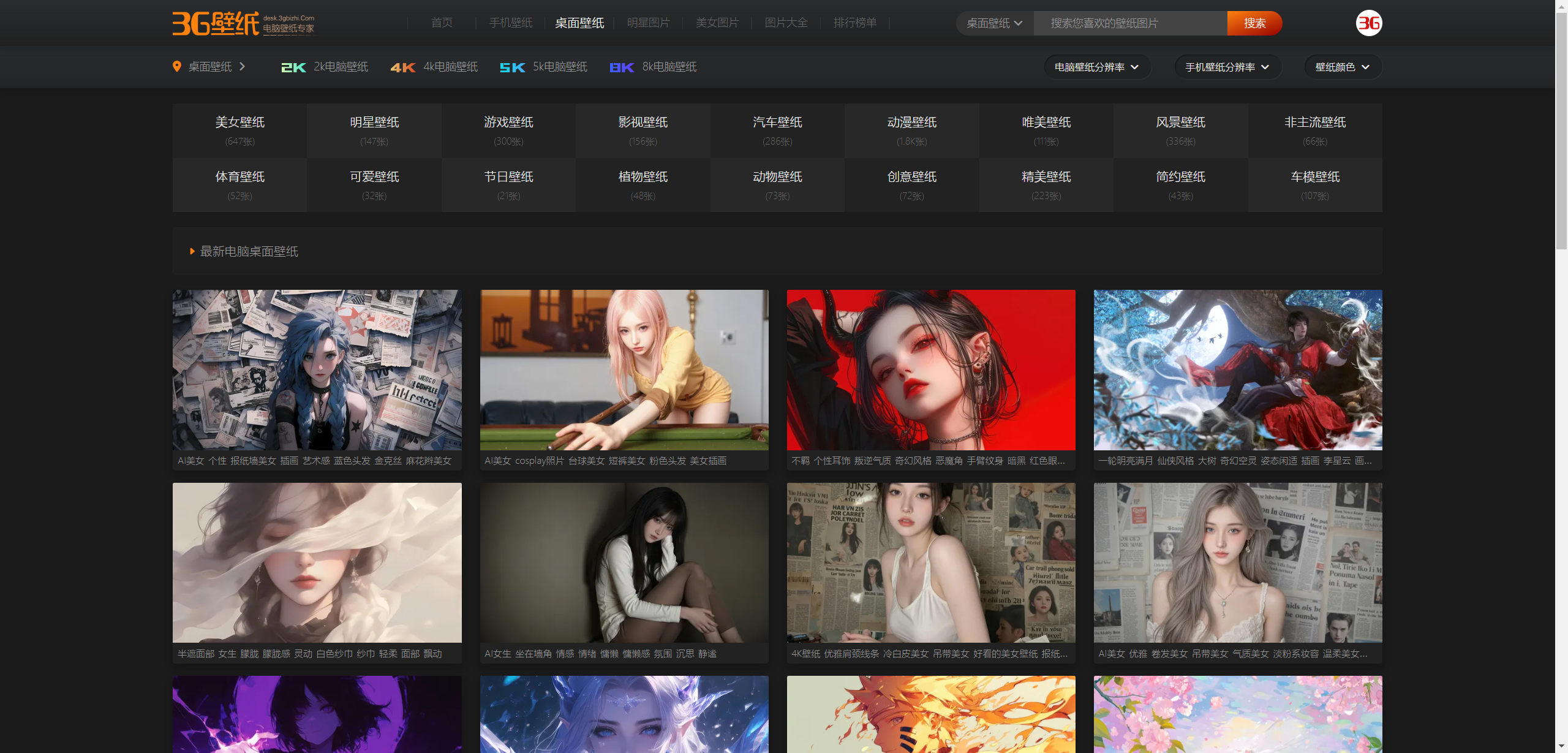 3G 壁纸是一个壁纸资源网站。网站内提供海量优质高清手机及电脑壁纸,清晰度可选 2K、4K、5K、8K,可按搜索或分类查找,也可按分辨率、颜色等标签筛选壁纸,或是查看全站下载排行榜。3G 壁纸提供的图片资源既可以成为美观的壁纸,也可以用作高质量的设计素材,十分值得收藏。