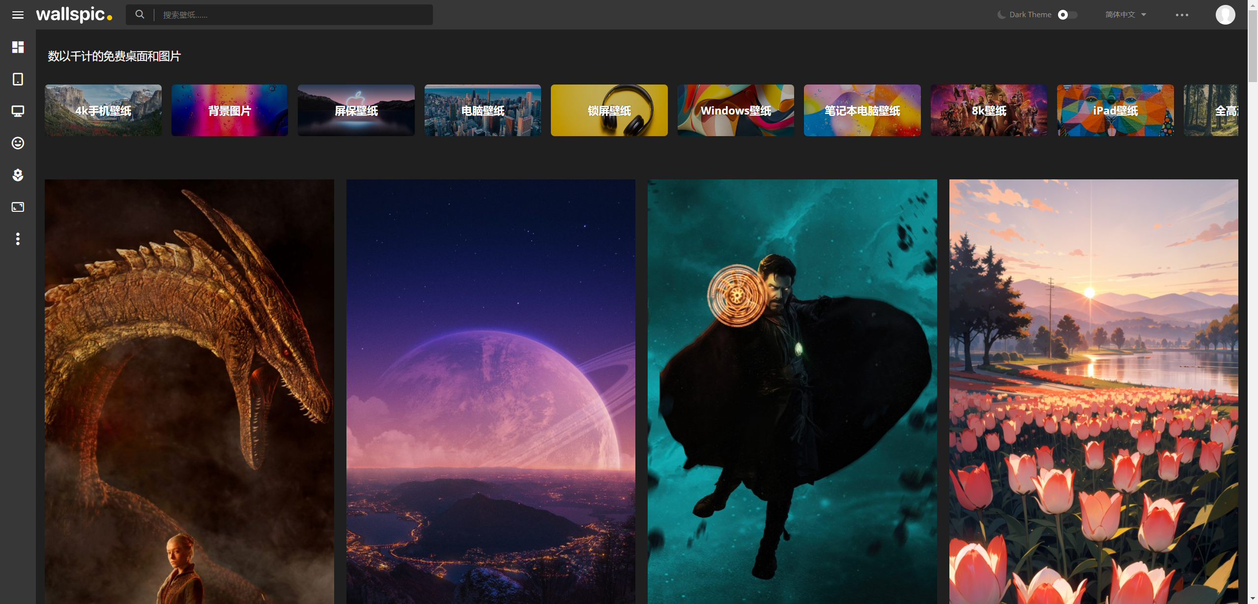 Wallspic 是一个可免费下载的中文壁纸网站。Wallspic 中有着主题各异的海量优质高清壁纸,支持手机及电脑,提供可适配苹果、安卓、电脑等设备的多种分辨率选择,最高可达 8K, 点击即可直接下载,无需注册、付费。Wallspic 支持中文、英文、西班牙语、法语等 6 种语言。