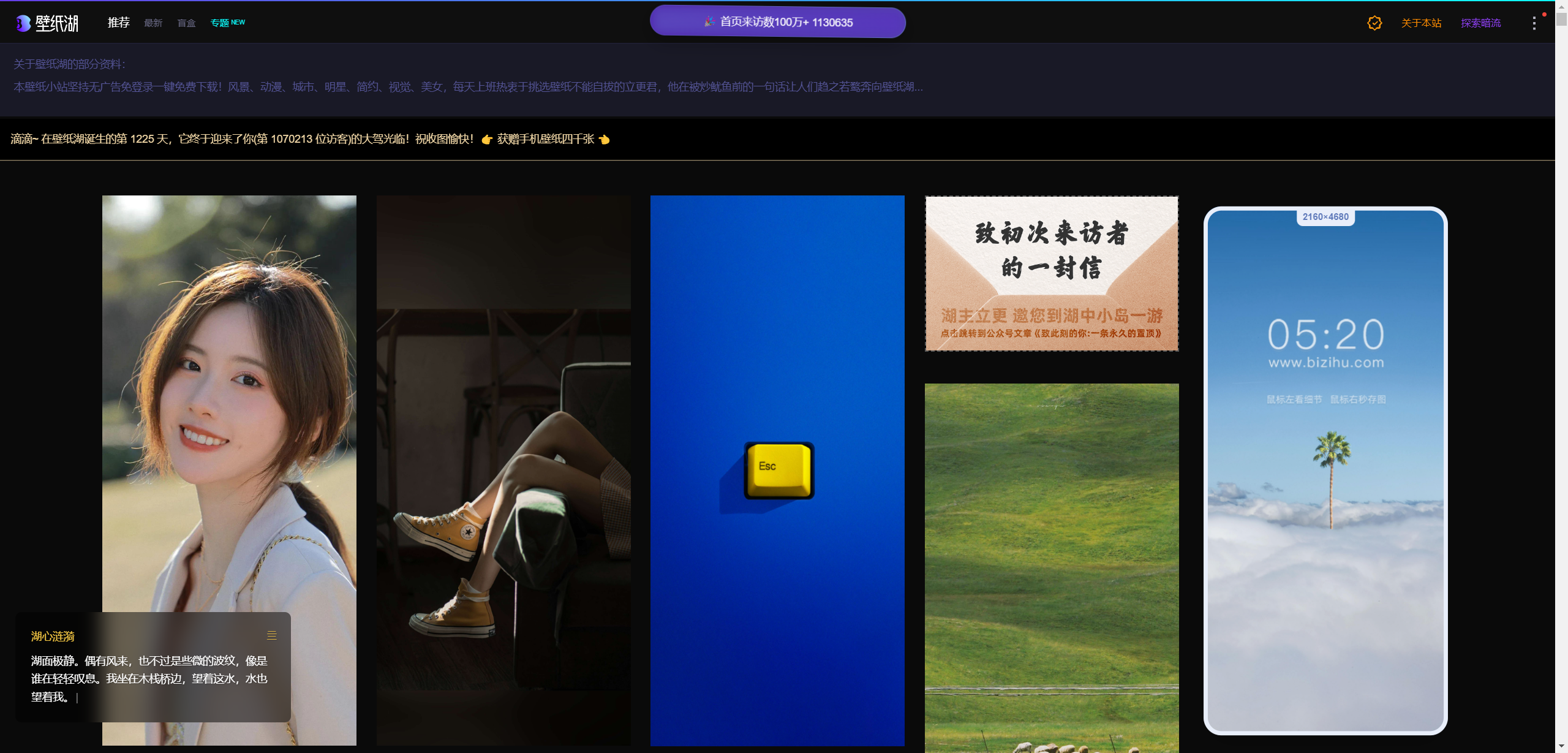 壁纸湖是一个由个人开发的壁纸网站,建于 2021 年。壁纸湖提供高质量的手机、电脑壁纸、微信背景,以及头像,网站内所有的内容都由站长精选,可按专题分类查看,也可以开盲盒、探索暗流的形式下载随机壁纸。全网站的内容都支持免费下载,无需注册登录,也无需关注公众号,鼠标右键点击图片即可一键下载,但不支持商用。总之,壁纸湖是一个非常值得收藏的资源网站。
