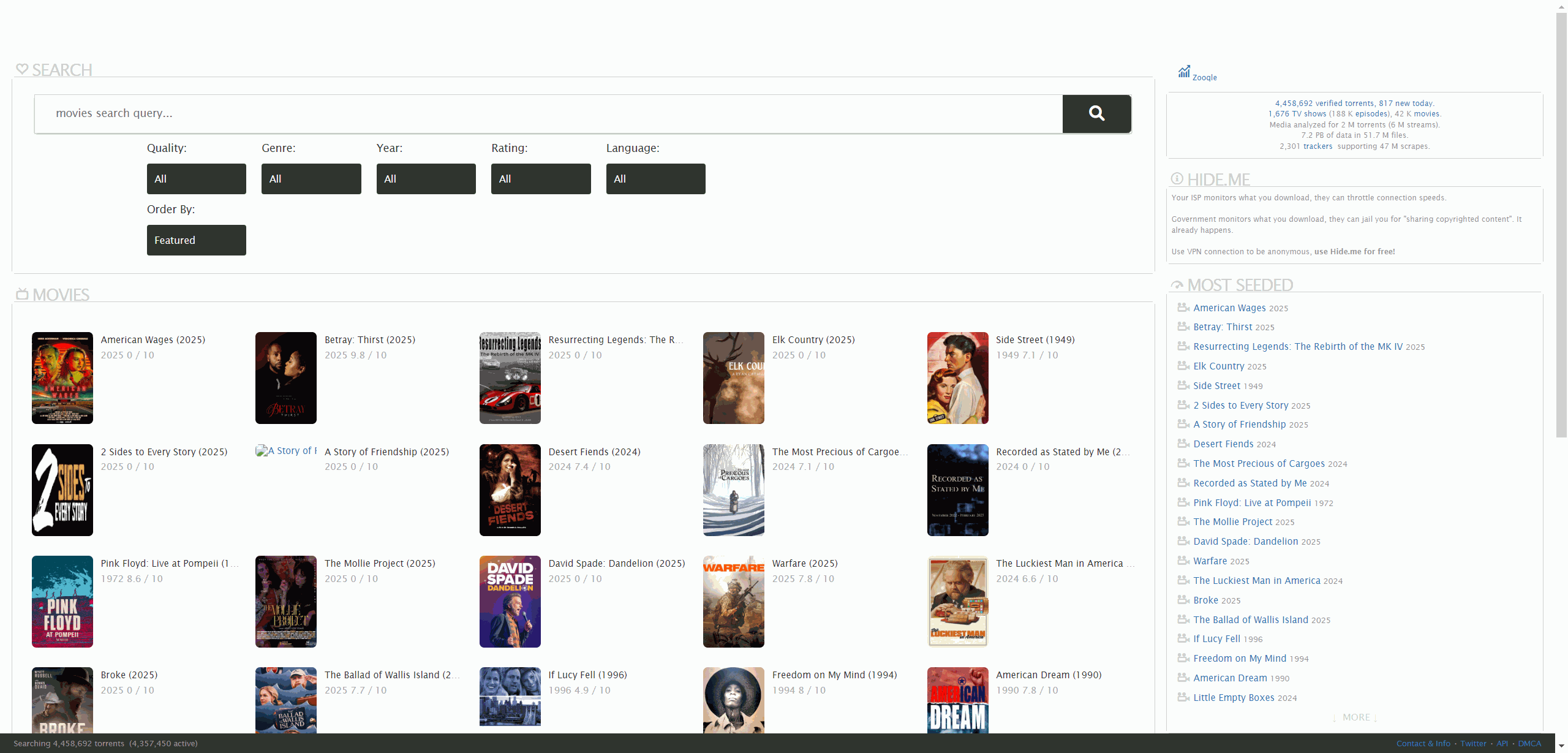 Zooqle 是一款国外的老牌种子、磁力链接搜索引擎。站内资源主要集中在影视方面,首页提供热门影视资源排行榜与资源列表,同时也支持关键词模糊搜索,搜索结果可按质量、类型、时间等分类。Zooqle 目前已收录四百多万份种子资源,并每日保持更新。