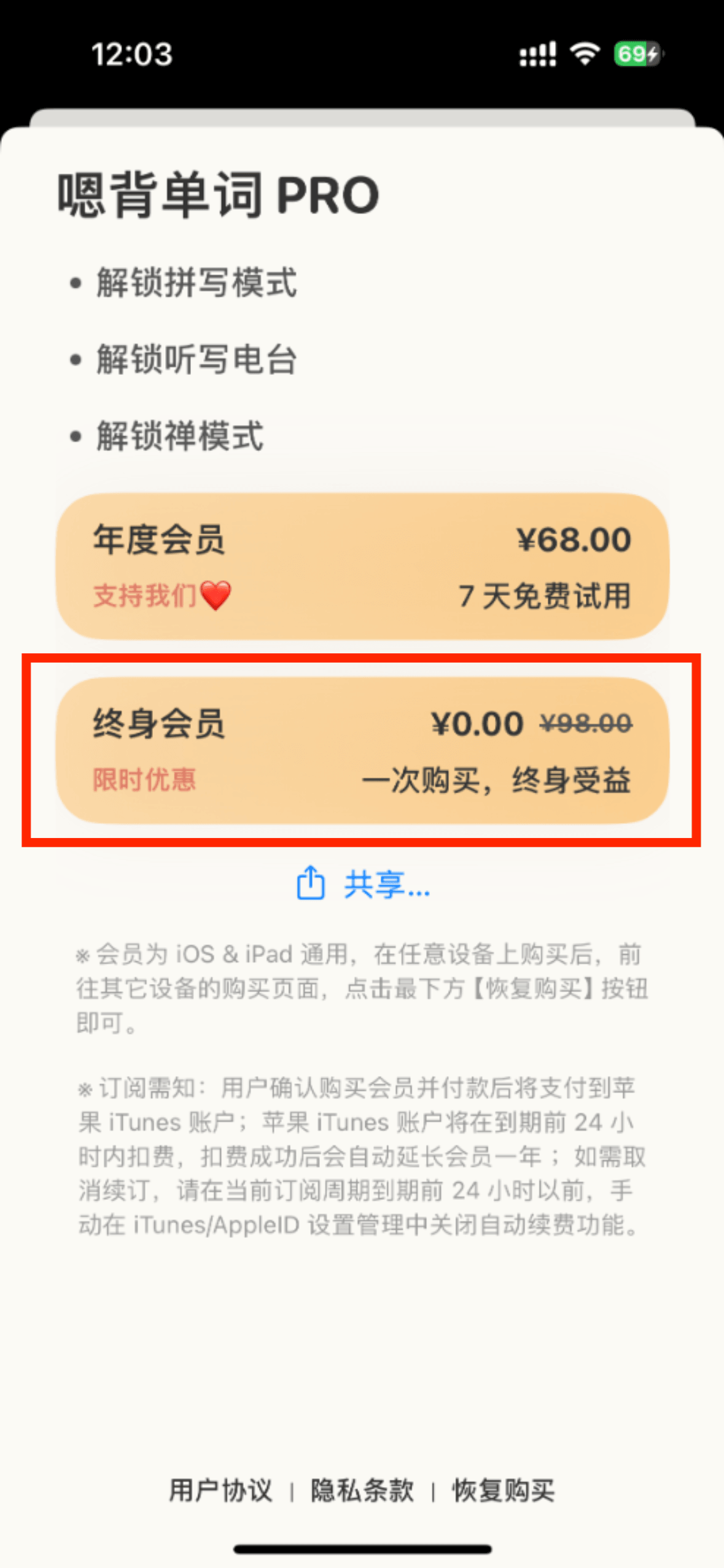 2、如果终身会员部分显示价格为 ¥0,则点击“终身会员”,如果不是 0 那么可以考虑一下是否要花钱购买。