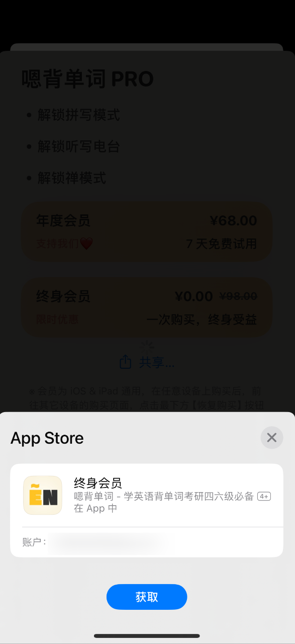 3、点击“获取”,输入苹果账号登录密码即可免费解锁终身会员。