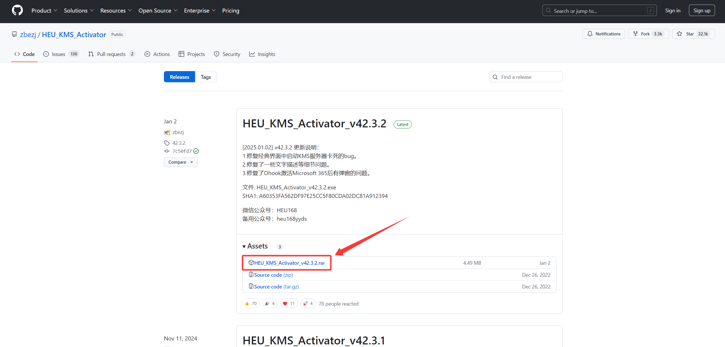 首先打开加速器,在 Github 的软件开发者的官方页面下载安装包:https://github.com/zbezj/HEU_KMS_Activator/releases,点击箭头所指的链接即可下载安装包。