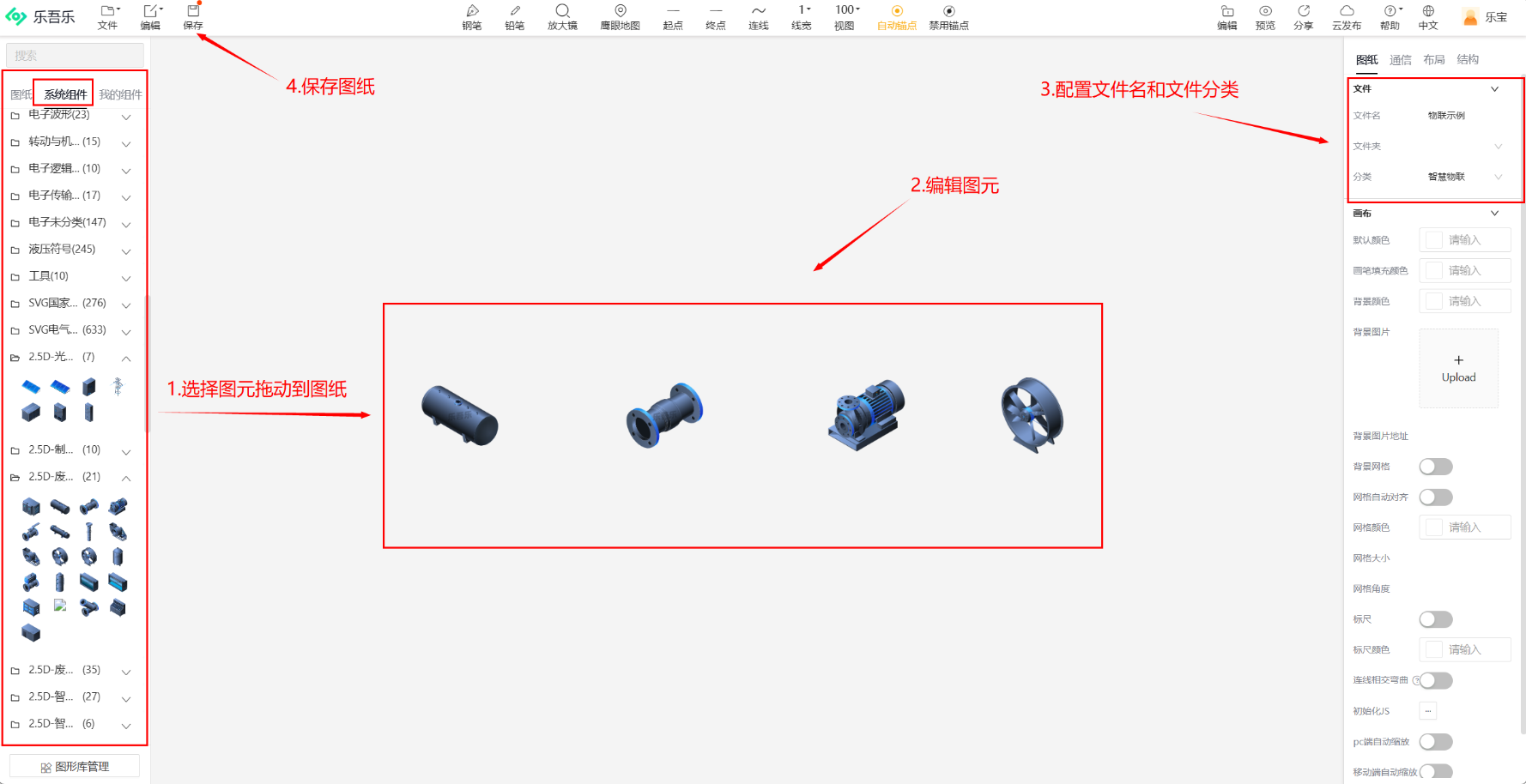在左侧的系统组件中拖动需要的组件即可将其放置在图纸上。点击素材可以对它进行编辑,双击可以更改素材中的文字。