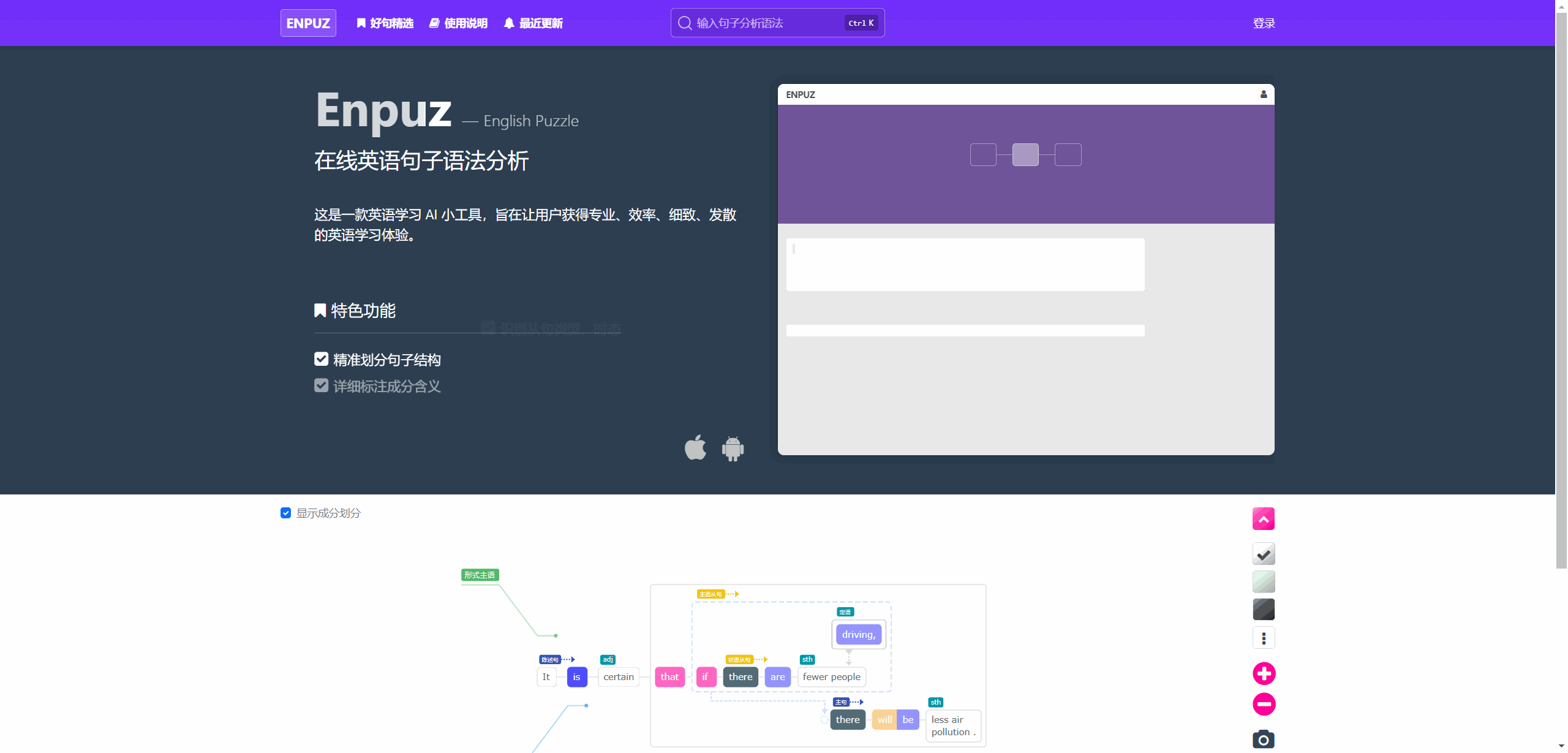 Enpuz 是一款在线的英语句子语法分析工具,旨在让用户获得专业、效率、细致、发散的英语学习体验。只需输入英语段落,就可以自动帮你划分句子结构,识别从句类型与时态,并为你详细标注成分含义、解析短语并拓展语法。同时,你也可以通过网站提供的“好句精选”在精心挑选的优秀例句里学习正确的英语语法。非常适合学生自学使用。