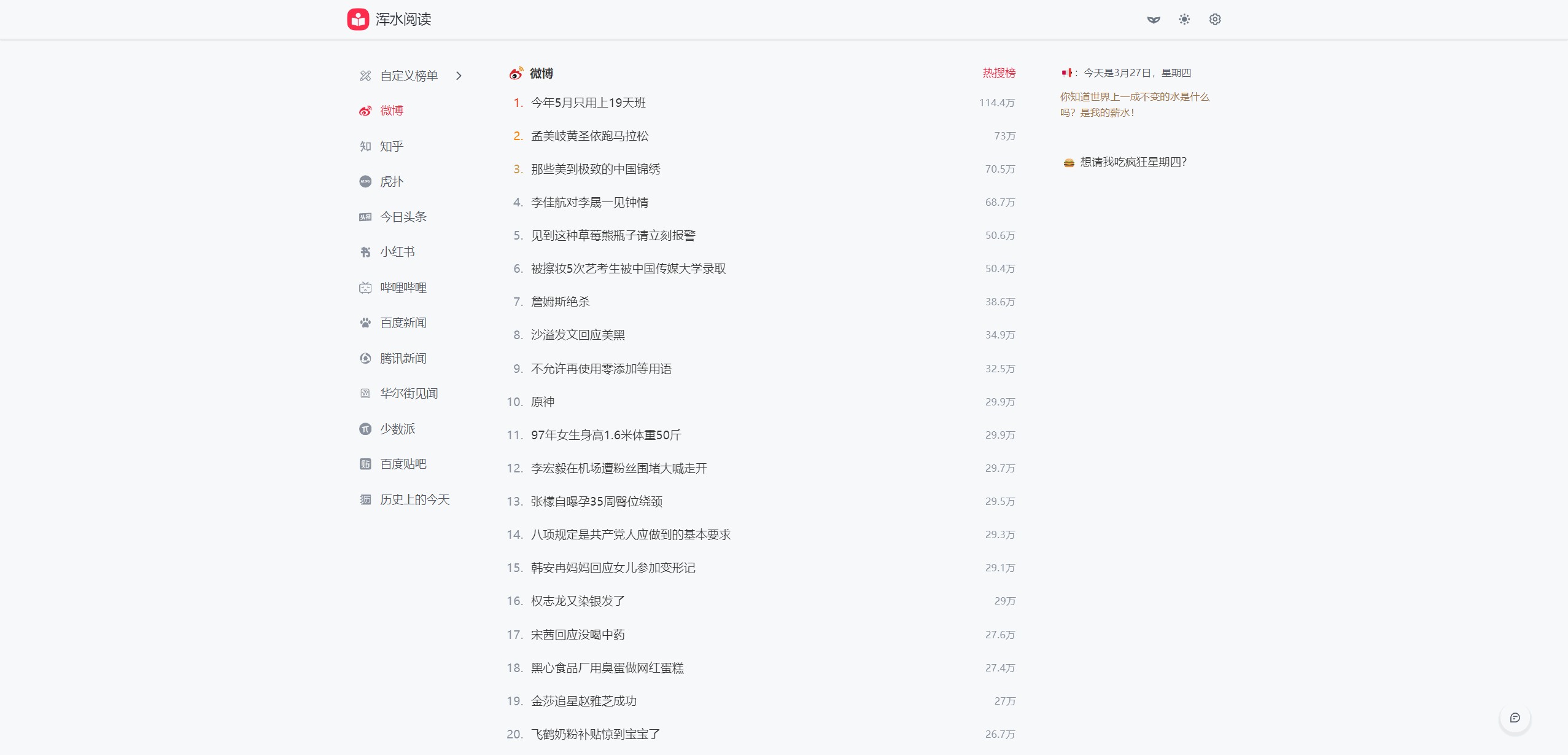 浑水阅读是一个适合上班摸鱼的新闻资讯浏览平台,旨在为用户打造便捷、全面的资讯浏览体验。浑水阅读整合了市面上主流的社媒平台,如微博、知乎、虎扑、小红书、今日头条、B站、百度、腾讯、华尔街见闻、少数派、百度贴吧等,实时更新各大平台的热门榜单新闻,并用模拟 Word 文档、阅读平台的显示形式呈现,让放松摸鱼不易被领导察觉,在繁忙的工作中开辟出一所独属于打工人的安全屋。